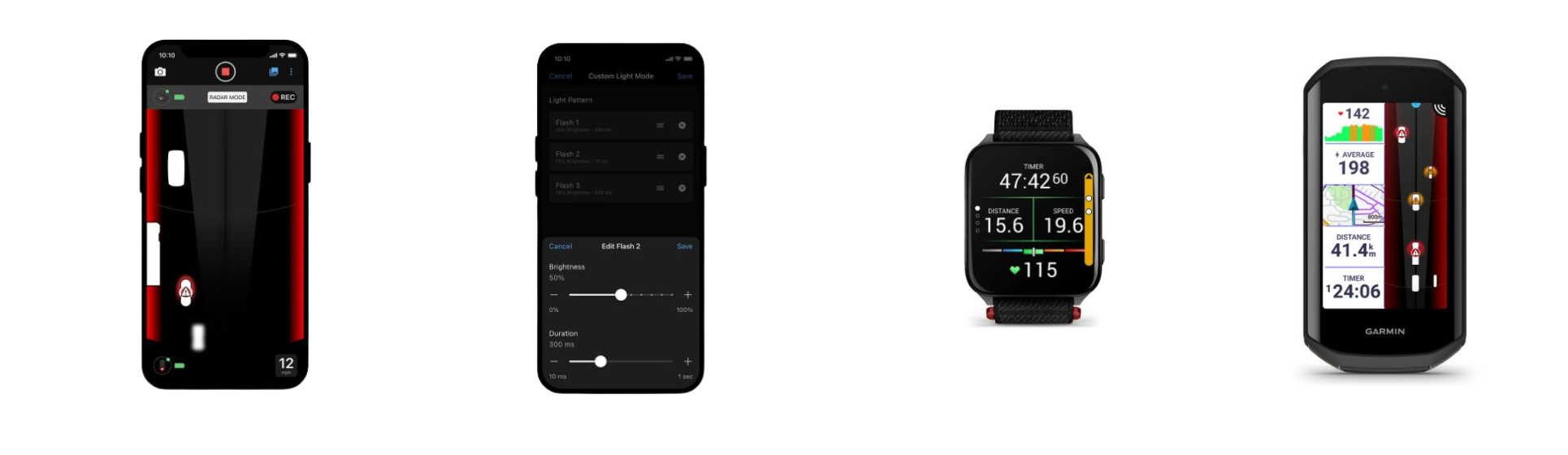 Ob povezavi z združljivimi napravami omogoča napredno spremljanje prometa – prikaz velikosti vozil (majhna, srednja, velika), zaznavanje menjave voznega pasu ter spremljanje ravni nevarnosti posameznega vozila. Deluje z Garmin Edge kolesarskimi računalniki, aplikacijo Varia v pametnem telefonu in izbranimi pametnimi urami Garmin, ki omogočajo vizualna, zvočna in haptična opozorila.